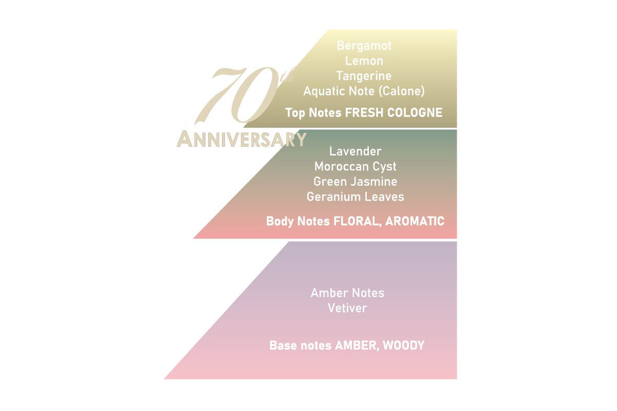 Notele clasice de citrice sunt însoțite de note acvatice răcoritoare, susținute de o inimă florală, aromată, bogată și echilibrată, toate așezate pe o bază de chihlimbar prețios.